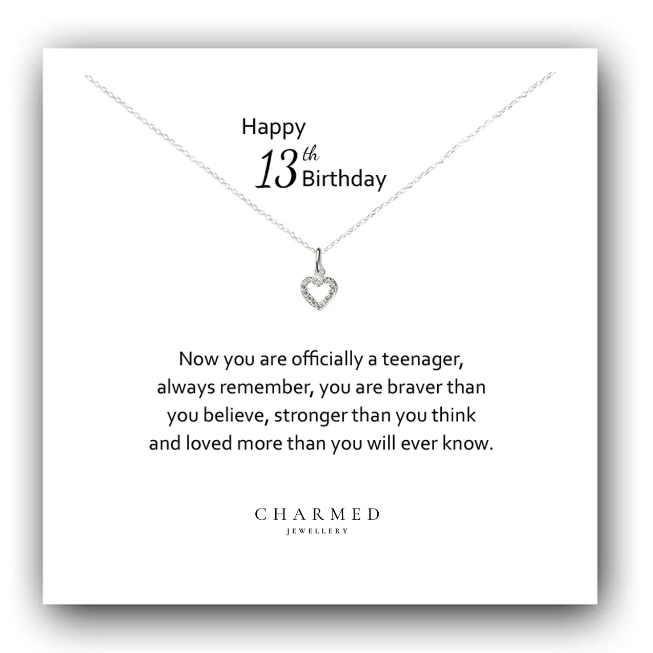 13th Birthday Heart Necklace with Cubic Zirconia in Sterling Silver 925, Personalised Jewellery Gift