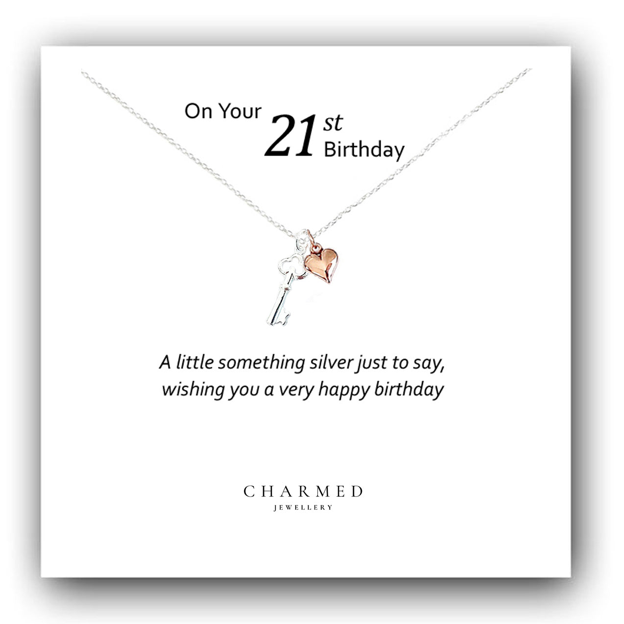 21st Birthday Key Necklace with Rose Gold Heart in Sterling Silver 925, Personalised Jewellery Gift