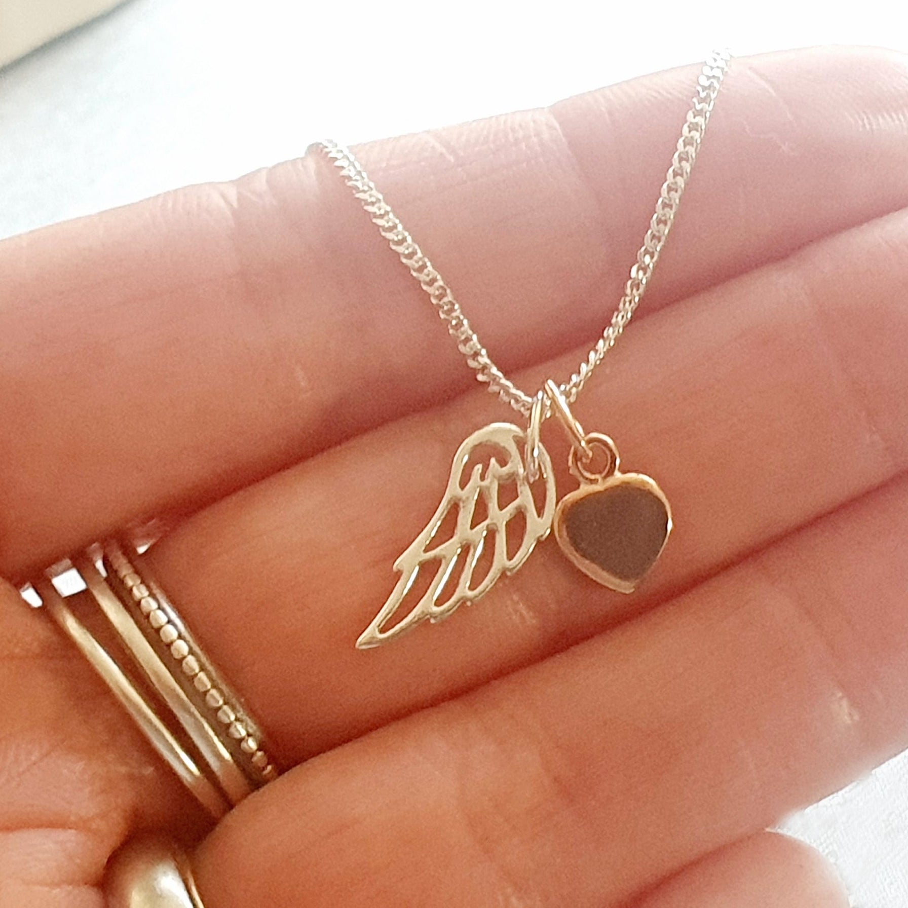Angel Wing Necklace with Rose Gold Heart in Sterling Silver 925, Personalised Jewellery