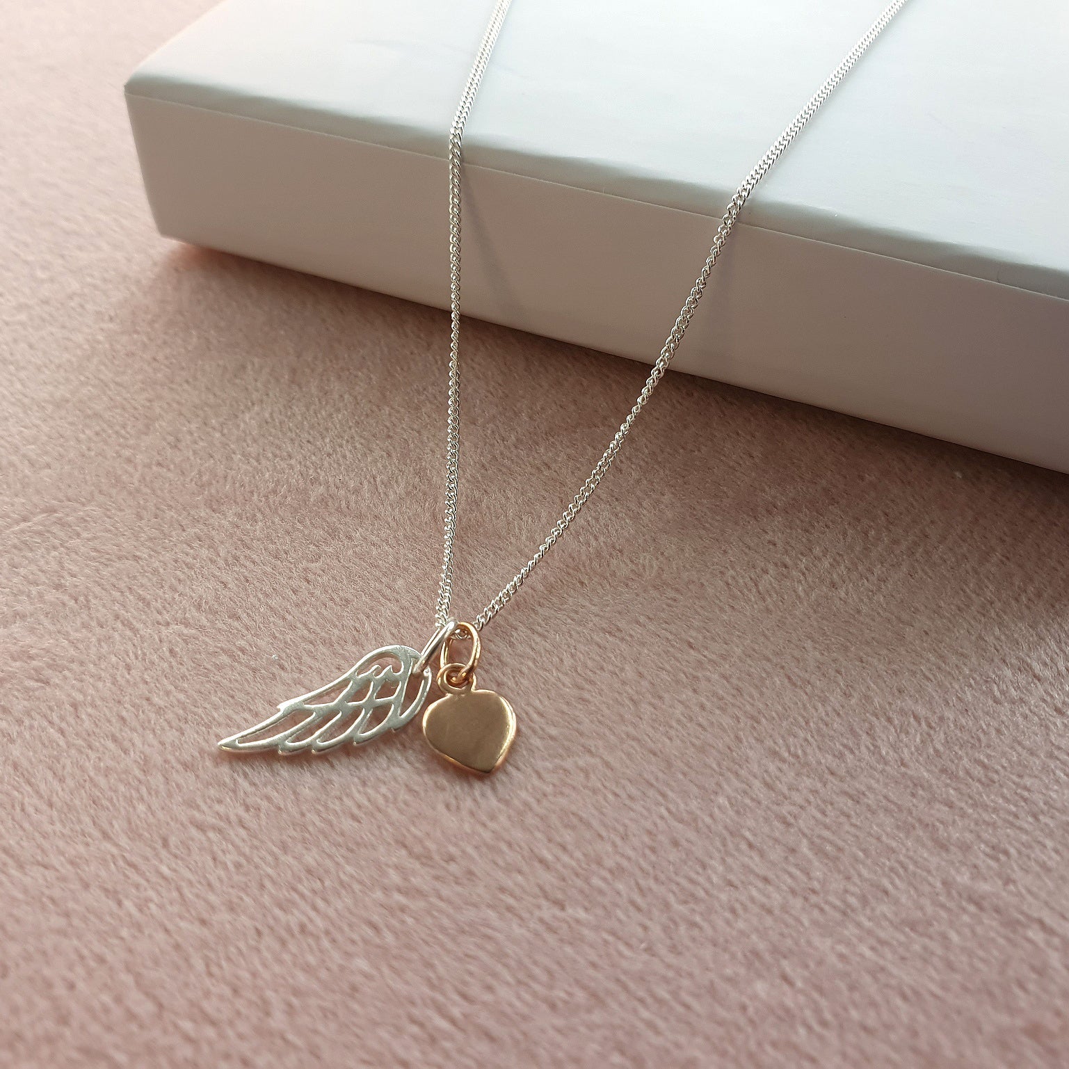 Gorgeous angel wing pendant in sterling silver 925, featuring a pretty rose gold heart. The angel wing represents the guardian angels and remembering your loved ones, creating a meaningful personalised jewellery gift for her.