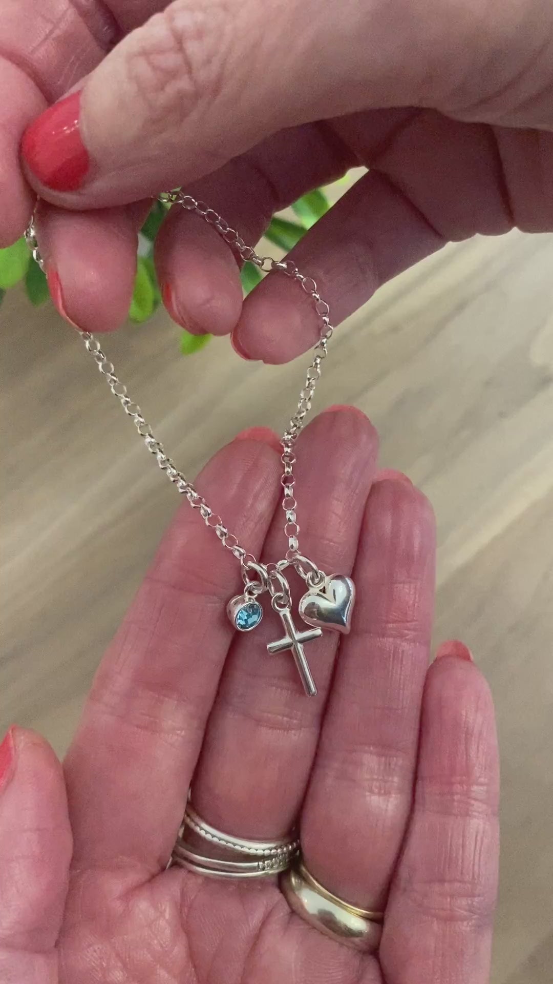 Celebrate faith and love with this Cross Heart Bracelet in Sterling Silver 925. Featuring a classic cross charm, a pretty puffy heart charm and a sparkling crystal birthstone of your choice, it’s a meaningful and personalised piece – perfect as a gift or a special treat for yourself.