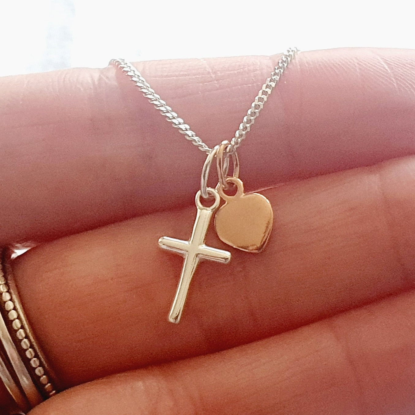 Gorgeous cross pendant in sterling silver 925, featuring a pretty rose gold heart. A perfect gift for a First Holy Communion , Baptism or Christening Keepsake.