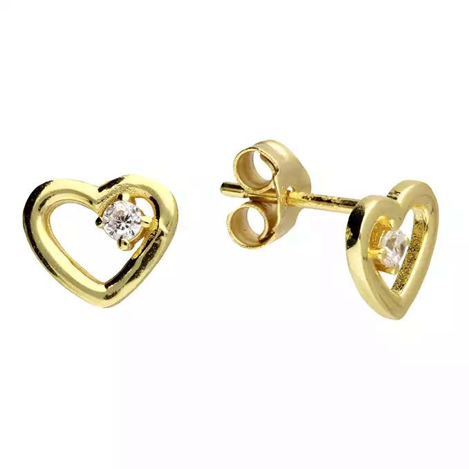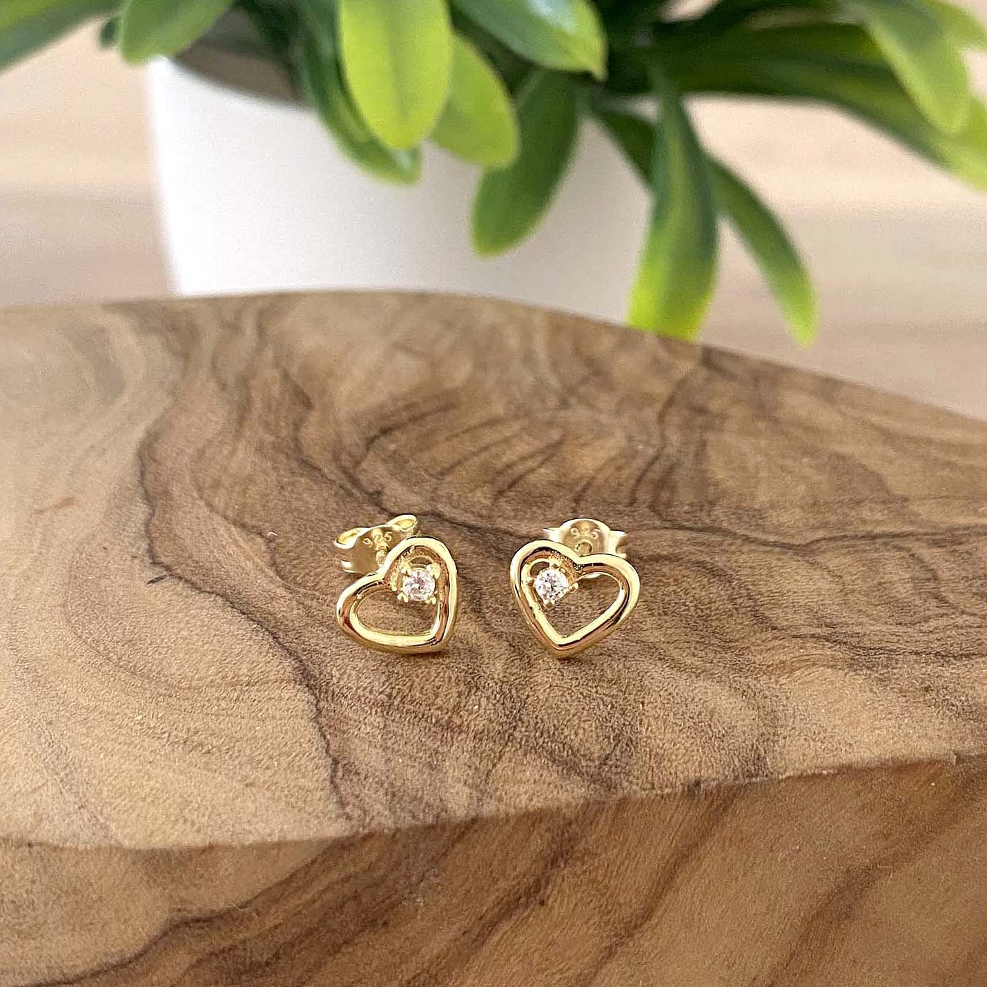Striking open heart earrings featuring a sparkling Cubic Zirconia stone, 14ct yellow gold plating on sterling silver 925. A unique birthday gift for a special daughter.