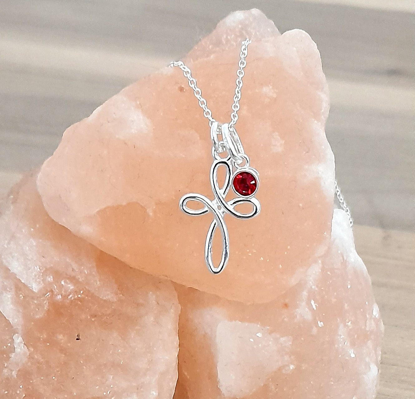 Beautiful cross pendant with a unique infinity design in sterling silver 925, with a pretty Swarovski crystal birthstone in the birth month colour of your choice. The stones represent the colour for each month. A perfect communion gift for a special girl. Let her know how special she is, with this personalised gift.