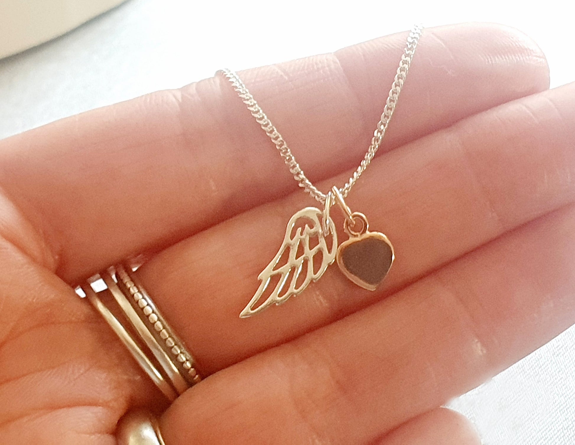 Godmother Gift, Angel Wing Necklace with Rose Gold Heart in Sterling Silver 925, Personalised Jewellery Gift