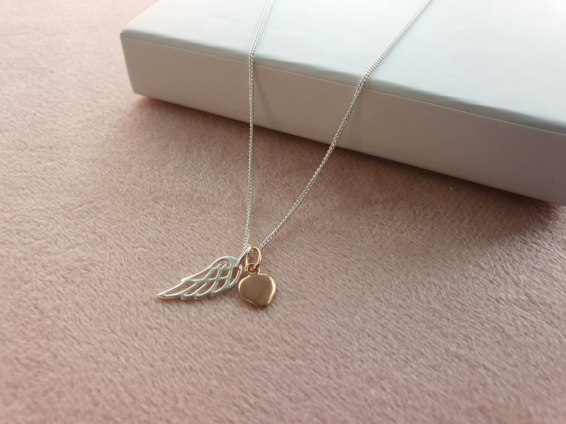 Beautiful angel wing pendant featuring a mini heart charm in sterling silver 925, with rose gold plating. A perfect christening gift for your godmother. Let her know how special she is, with this personal and unique gift.