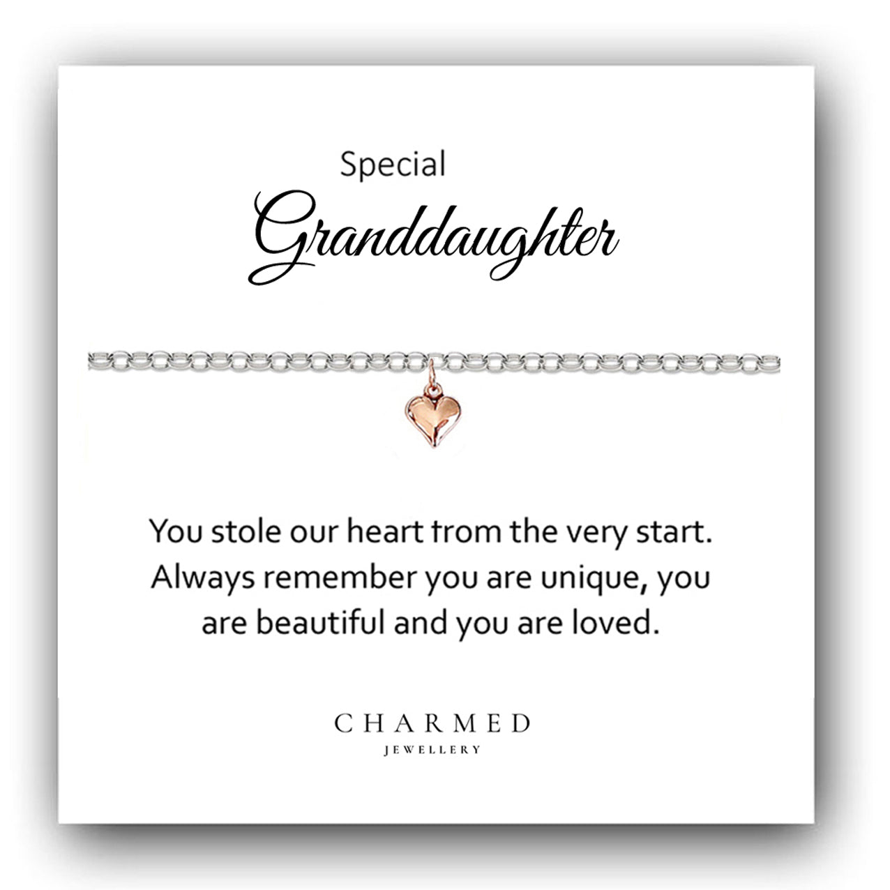Choose this stunning heart bracelet as a beautiful gift for a granddaughter. A perfect personalised gift for her, to let her know how much she means to you.
