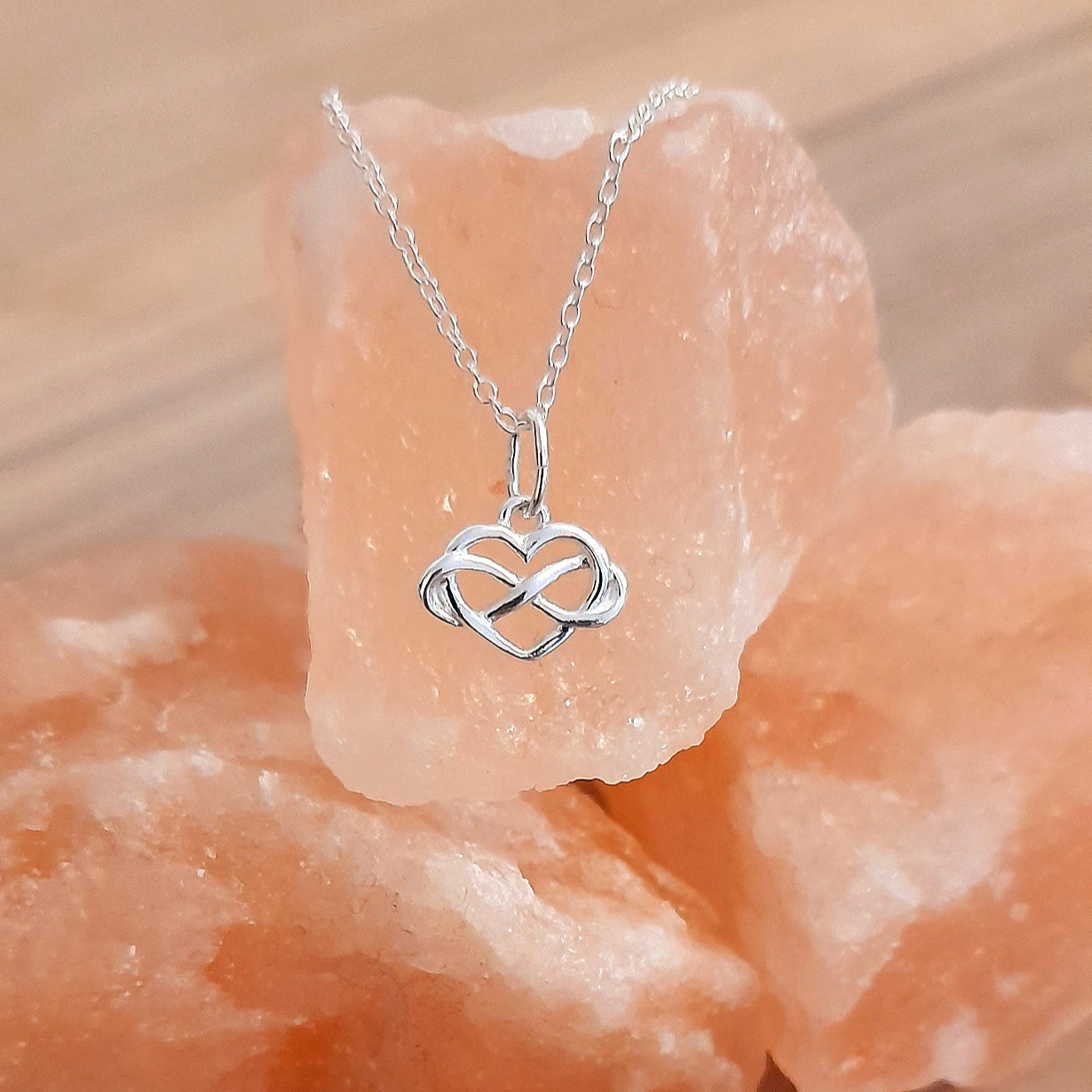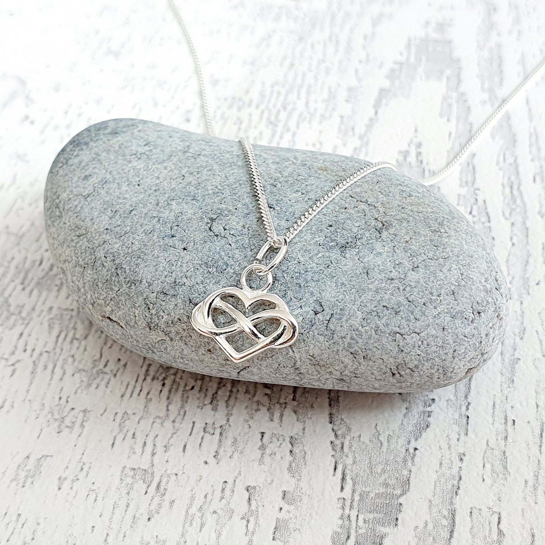 Striking infinity heart pendant and stud earrings with the meaning love is limitless, in sterling silver 925. A unique birthday gift for your granddaughter.