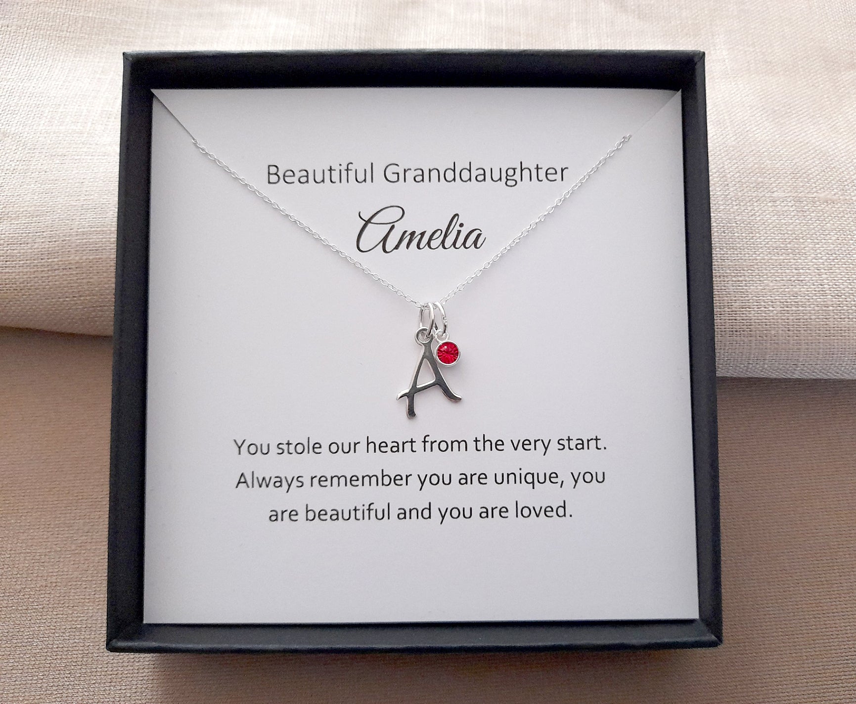 Granddaughter Initial Necklace with Birthstone in Sterling Silver 925, Personalised Gift