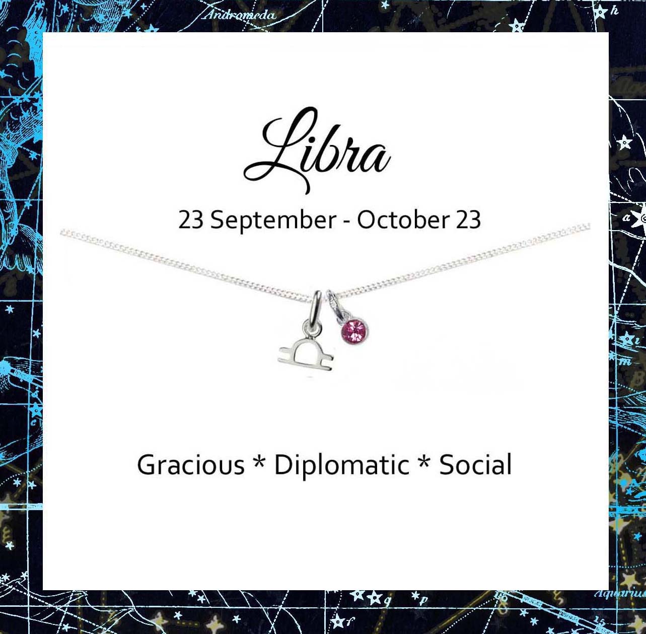 Libra Zodiac Necklace with Birthstone in Sterling Silver 925, Personalised Gift