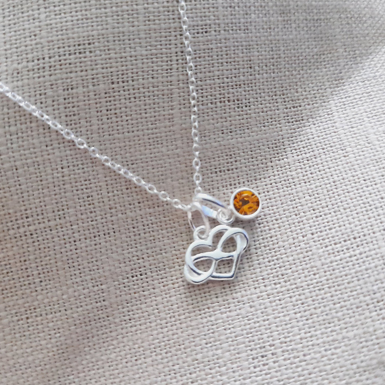 Striking infinity heart pendant with the meaning, love is limitless, in sterling silver 925, featuring a pretty crystal birthstone in the birth month colour of your choice. The stones are Swarovski crystal and represent the stone colour for each month. A perfect birthday gift for your mum. Let her know how special she is, with this personalised gift.