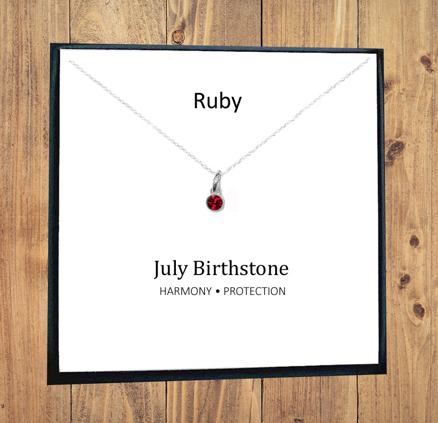 Gorgeous Ruby pendant in sterling silver 925. The Ruby birthstone is Swarovski crystal and represents the colour for a July birthday. The mounted card includes the qualities of being born in July, creating a meaningful gift for her.
