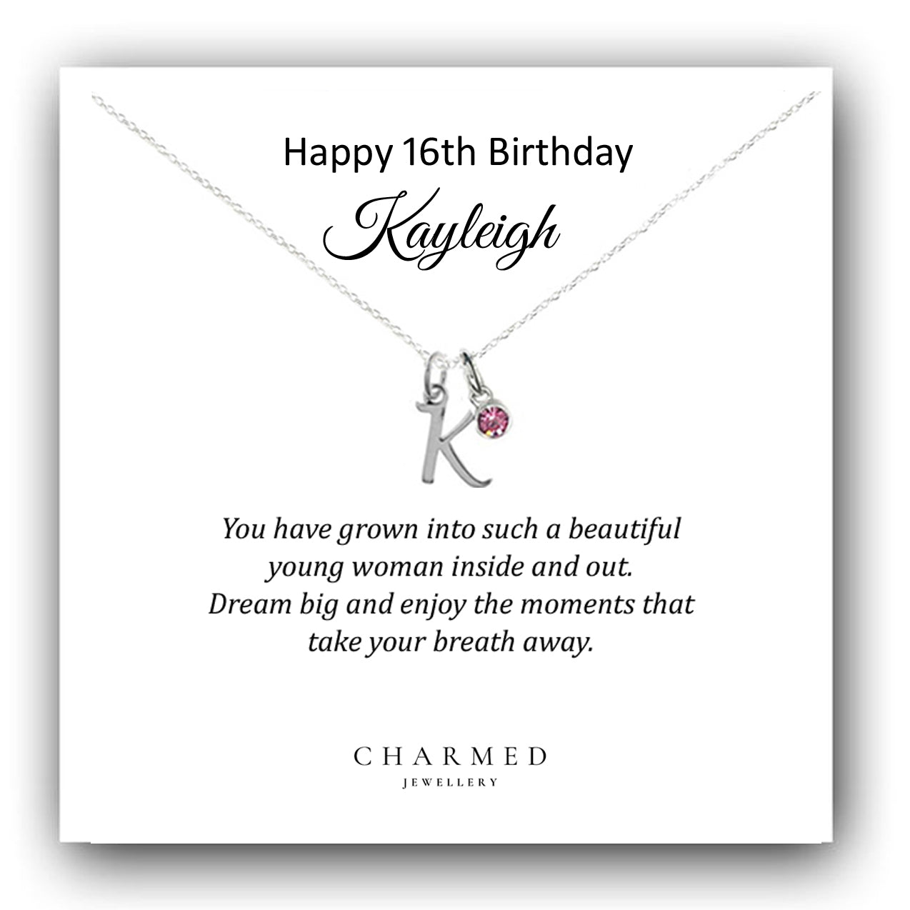 Striking initial pendant in gorgeous script lettering, features a pretty crystal birthstone in the birth month colour of your choice. The stones are Swarovski crystal and represent the stone colour for each month. A unique 16th birthday gift for teen girls.