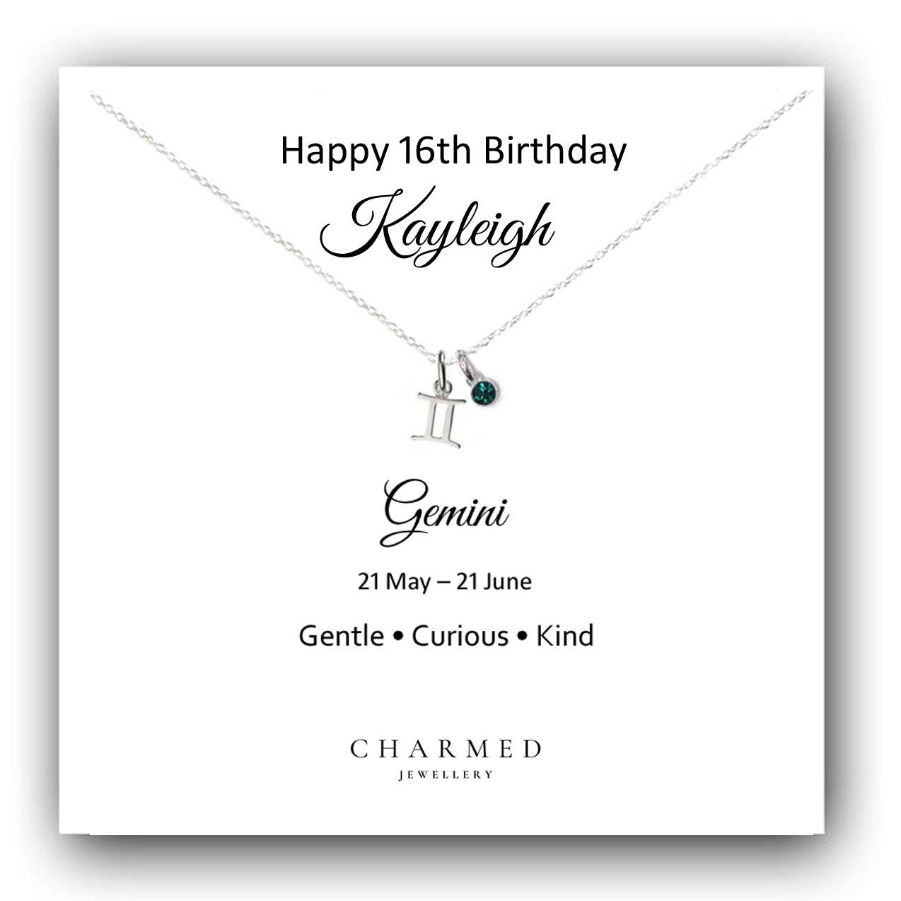 Sweet 16 Zodiac Necklace with Optional Birthstone in Sterling Silver 925, Personalised Jewellery Gift