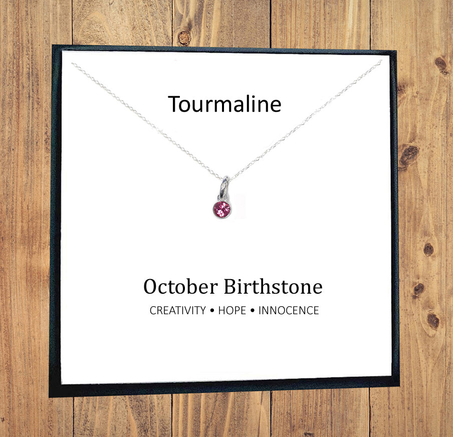 Gorgeous Tourmaline pendant in sterling silver 925. The Tourmaline birthstone is Swarovski crystal and represents the colour for an October birthday. The mounted card includes the qualities of being born in October, creating a meaningful gift for her.