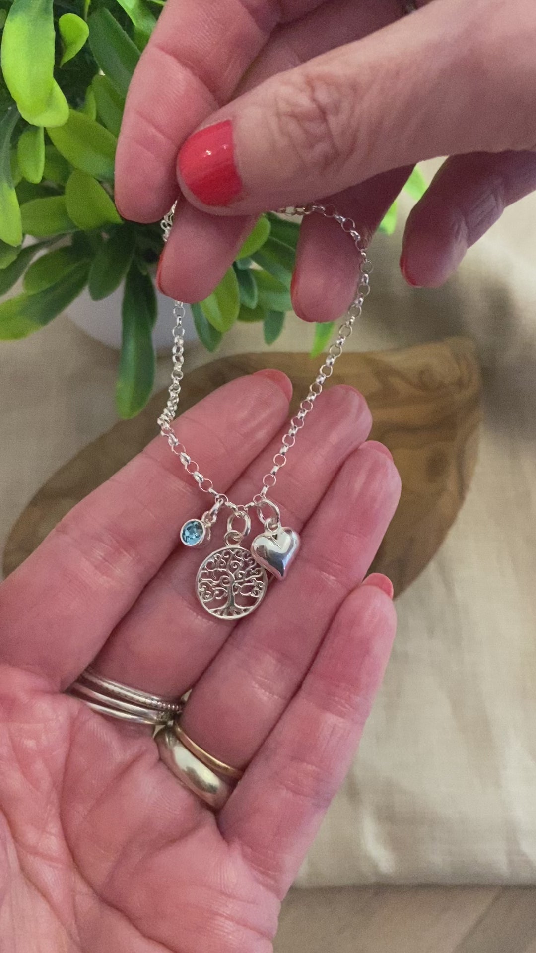 Carry meaning and style with this Tree of Life Bracelet in Sterling Silver 925. Featuring a symbolic tree of life charm, a sweet puffy heart, and a sparkling birthstone of your choice, it’s a thoughtful and personal piece of jewellery.
